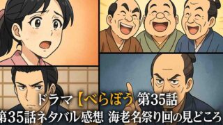 ドラマ ドラマ【べらぼう】第35話ネタバレ感想|海老名家祭り回の見どころ NHK大河ドラマ『べらぼう~蔦重栄華乃夢噺~』の第35話「間違凧文武二道」が2025年9月14日に放送されたよ!今回は蔦重の風刺がまさかの方向に転がっていったり、峰竜太・林家正蔵・林家三平の“海老名家アベンジャーズ”共演でSNSが超盛り上が... ドラマ