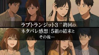ついに『ラブトランジット3』最終回が配信されて、SNSが大盛り上がりだったね!元恋人たち5組10人が、“復縁するのか、それとも新しい恋へ進むのか”という究極の選択を迫られる展開に、涙した人も多かったはず。この記事では、最終回の結末をネタバレ...
