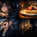 砂漠で手を繋ぐ男女や夜のバーベキューで不安げな少女、手紙を持ち決意の笑顔を見せる少年の姿を描いた4分割のアニメ風イラストイメージ リアリティショー
